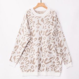 Super soft and cozy oversized tunic sweater that can be worn as a top or dress! White and beige leopard animal print. Slight oversized fit.