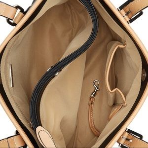 Exterior features silver-tone hardware, logo plaque and 1 back zip pocket
