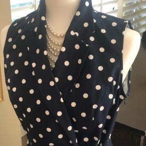 Knee length navy polka dot dress. Four pleats in skirt with belt.