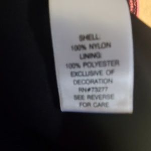 -Navy and white check. Zips up front, ties at bottom.