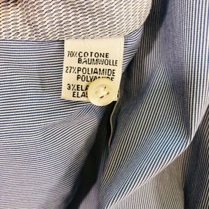 Color & Pattern: Blue and white micro stripe with woven pattern on cuff, placket and collar interiors