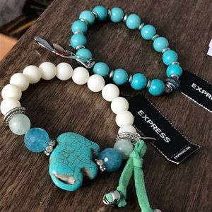 Matching set of two bracelets from Express. Blue and white stretch bead bracelets. New With Tags, Never Worn. Beautiful glass beaded bracelets, white and blue marble tube beads. Elephant is made of a turquoise type bead with faux leather accent. Blue beaded bracelet features a silver tone feather charm. Perfect summer and fall addition to your bracelet stack! Smoke free home.