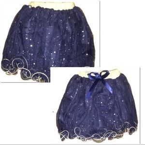 FTS include a long sleeve dark blue t-shirt w/ pearl details, a button up pink jacket with a ruffled hem and textured & stretchy fabric, a dark blue glitter skirt with an elastic waist & glitter and bow details AND a fabric clip on flower! SO CUTE!