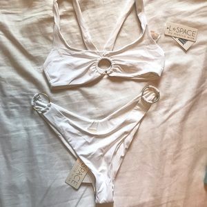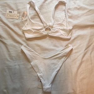 Dana Bottom: white w/ gold rings on both sides, original liner, orig. $84, bitsy cut (minimal coverage, about a 2 on a 1-5 lowest (1) to fullest (5) coverage scale for brand), high cut hips