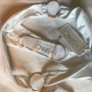 Julia Top: white, w/ gold ring in front & back, orig. $95, medium coverage, medium support, straps NOT adjustable.