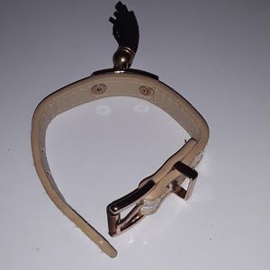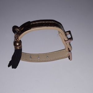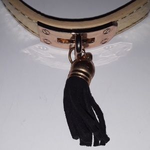 Belt buckle on an adjustable gold leather bracelet with a black tassel detail