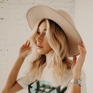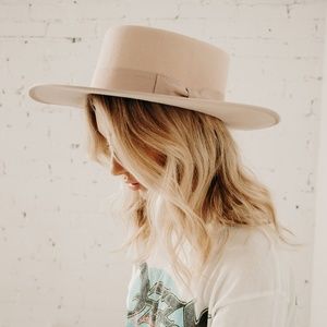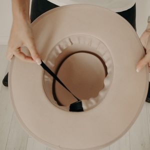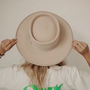 Lack of Color and GiGi Pip vibes. If you've been looking for the most badass, stiff brim, HIGH QUALITY hat then look no further. In the dreamiest cream/blush color it goes with anything. Made of 100% wool and that muted ribbon is swoon worthy. 4" brim + grooved oval crown + adjustable inner velcro band to fit any head size, NO MORE CONFUSING SIZE CHARTS...Enough said. Scarf in last photo not included