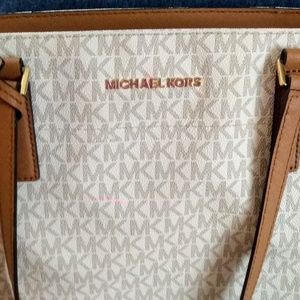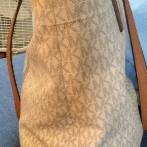 Large tan and light brown Michael khors tote bag. Never been used perfect condition. Light tan interior. Light brown medium leather straps. Lots of room with plenty of pocket's, lightweight. It goes well with any occasion
