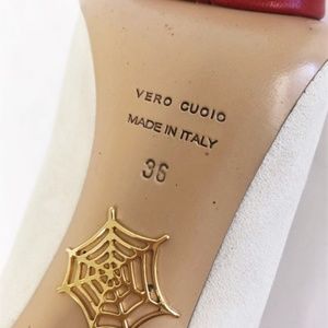 Pre-loved. Smudges on heels above pins. Small nick in leather on right heel. 2 faint gray smudges on exterior side of left shoe. Thin scratch in suede on interior side of right shoe. Leather is smudged and wrinkled on platforms above soles. A few small smudges and faint toe marks on insoles. Does NOT come with box or dustbag. Retails for $945!