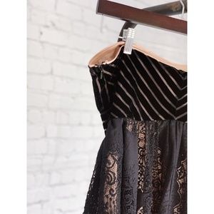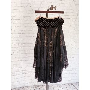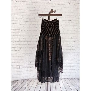 New without tags! Stunning midi dress with an asymmetrical hem featuring a lacey design with a luxe velvet-adorned bodice. The velvet and lace duo w/ the handkerchief hem is beyond beautiful & fun!