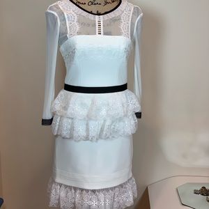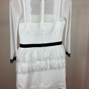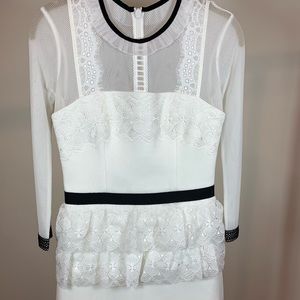 Patterned mesh and delicate lace cover the structured shell on this modern Three Floor dress. Contrast trim adds a graphic touch, and the a sheer yoke and back panel reveal a veiled peek of skin. Hidden back zip. Long sleeves. Lined.