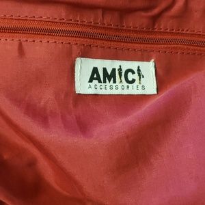 Centage style distressed read vegan leather purse with flower detail has side Zip pocket on back and one zip-up pocket inside and 2 other pockets The zip-up pocket has numbers written Inside as shown inpictures base of lining also has to faint marks also shown in picture Otherwise an excellent condition Majors approximately 15" across and About 7" deep Straps can be worn on shoulder or carried by hand purse measures Approximately 21" from top of straps to base of purse