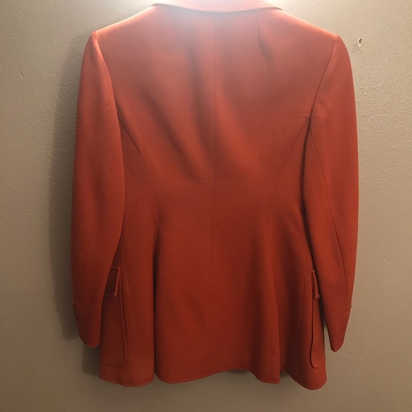 100% wool matching blazer and vest in your classic ‘70’s era rust colored orange. The sizing could be UK, because it says 6 and this would make it a 2 for US sizing. Arm length is typical for this size.