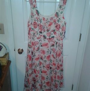 This is a stunning pink floral dress. Size Large and made by Triuhuology. I purchased for a wedding and ended up wearing something else. This laying below the knees. Beautiful flow...these pics don't do justice.