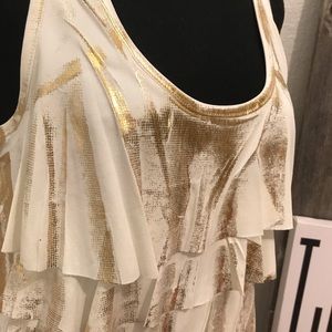 Fun and flirty long tank. Cream color with a fun gold stamped or brushed effect.