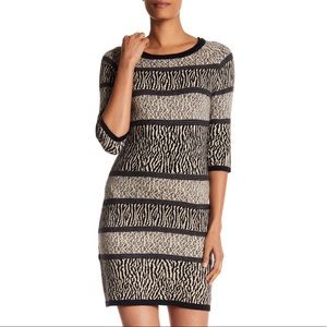 *NWT* black Papillon animal print panel sweater dress in a size S. Features 3/4 sleeves, boat neck, lightweight knit construction, pullover styling & seam detailing throughout. Approximately 34" length. Material: 45% acrylic, 45% viscose, 5% spandex, 5% viscose.