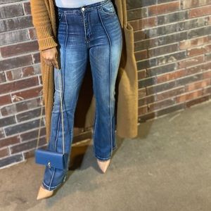 A washed denim featuring bell bottom with 2 front pockets and 2 back lip pocket. Jeans feature front pintuck detail