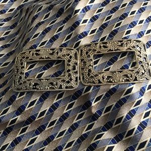 Accessories for pumps used in the ‘30s to maybe ‘60’s . Stamped copyright MUST. Gold tone. Matching. Very detailed no scratches or dents. Recently saw “shoe jewelry” in the last WHBM catalogue!!