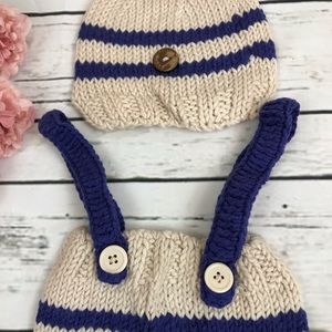 This adorable soft hand knit outfit is a soft shade of khaki with navy blue stripes. It has blue suspenders that button in the front, and an adorable matching stocking cap that has a button for added detail.
