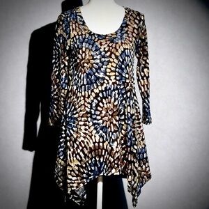 Premise 3/4 sleeve shark bite knit tunic top. 95% polyester and 5% spandex. Length is 29" at the shortest and 34" at the longest points. Sleeve length is 19" and from pit to pit is 17". (All measurements were taken while the top was laid flat and are approximate.)Machine washable. Size S