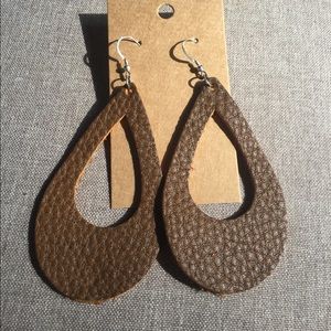 Brown leather teardrop shaped earrings with sterling hook style post - handmade - NEW