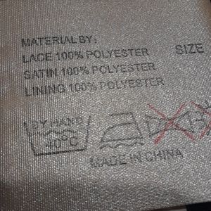 @brinahmorgan hi! i just added pics of the tags. 100% polyester. the dress has 3 layers: lining, satin, and what is listed as lace but i would say is really tulle-like.