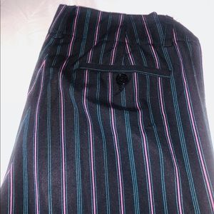 Navy blue pants with pink and light blue pinstripes
