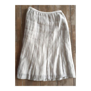 Lovely pleated skirt by Nic and Zoe, in excellent used condition. Sheer outer is fully lined and delicately pleated for a soft, feminine look. Pale silver grey color. Slight flare shape. Can be dressed down with a jean jacket or dressed up with a silky black tank, heels, and a colorful clutch. Approx measurements 36" waist, 25" long.