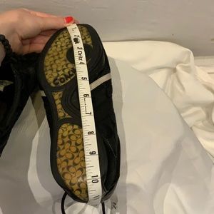EUC-Coach black and white lace up sneakers. Unknown size: Length (toe to heel) 11in Width (smallest width) 1.5 in. In great condition! No scuffing on bottom of shoe, shoe laces perfectly intact, and no signs of major wear. Some minor indications of wear on the inside of shoe and some barely noticeable discoloring on the outside of shoe (see pictures). Great shoes for literally any occasion!