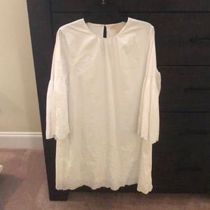 It’s a straight white dress with bell sleeves with a beautiful design. Only worn a few hours for a wedding once.
