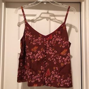A delicate butterfly-flecked floral cami with pretty details inspired by vintage underpinnings (see: narrow straps, covered buttons). Not just for date night, this top layers perfectly over a fitted tee.