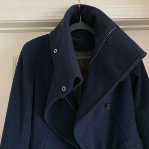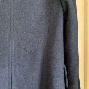 Beautifully designed coat with buttons + zipper. Well made and VERY warm - 65% Wool, 15% Cashmere 20% Nylon. Has a small tear in lining (thread is coming undone ) near collar /shown in picture/- completely fixable. Zipper detail in the back and on sleeves. Very versatile. In good condition. Sad to let it go.