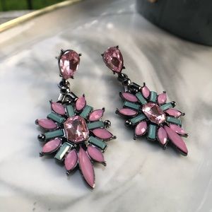 Summery water drop earrings in a lovely shade of pink and blue. Material is a copper alloy. Appx 2” long.