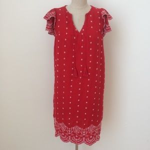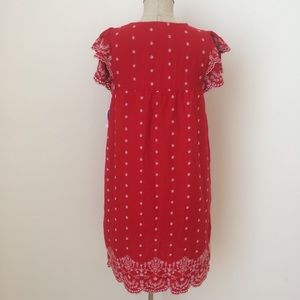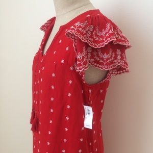 Vibrant red ruffle sleeve dress with white embroidery style. Tassel drawstring neckline can be worn tied or open. Super cute for the 4th of July or any summer gathering.