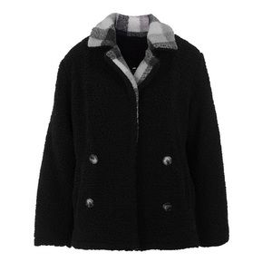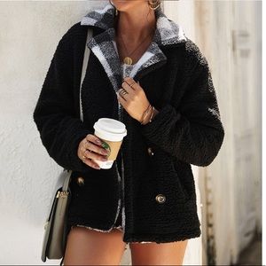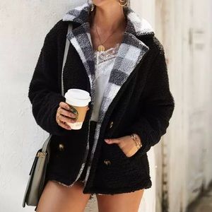 Stay warm and stylish this fall with our black teddy fuzzy plaid collar double breasted jacket with pockets. No closure.