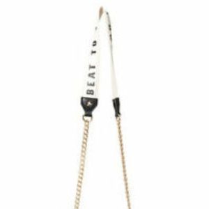 This playful crossbody features a drum-shaped silhouette that zips open. Two pom poms look like drum sticks for a playful touch.