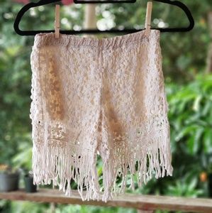 Beautiful ivory crochet short with elastic waste band and fringe. No stains or tears. 100% cotton