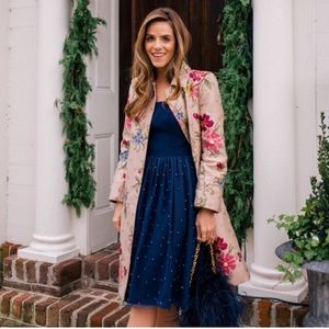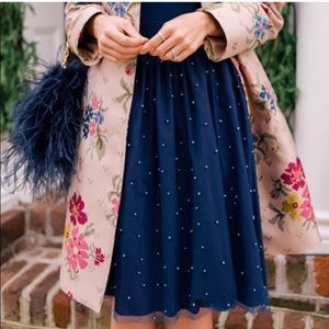 A vintage-look dress that's a welcome sight anytime is gorgeously structured in crepe and peppered with pearly beads at the shoulders and mesh skirt.