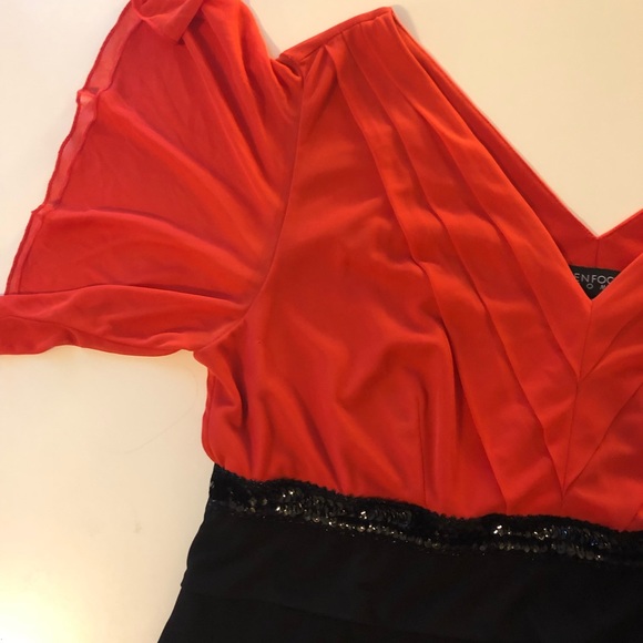 Black and coral ruffle dress with sequence belt/strip across front.