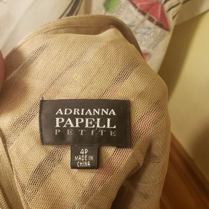 Beautiful Adrianna Papell Champagne Ruffled Dress. Zipper in back, works well with hook to keep secure. Dress is lined. Dry Clean only. Size 4 in Petites. Bottom of the dress is scalloped.