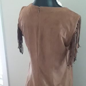 Express Faux Suede Dress with Fringe sleeves, V-Neck, Carmel Color.