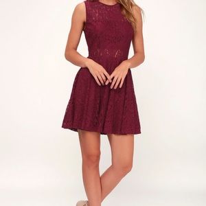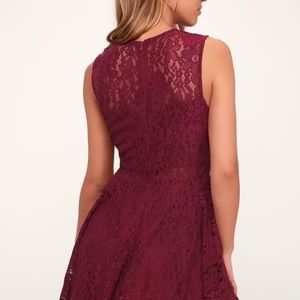 Lulus Exclusive! We are all about the flirty cutout look of the Lulus Everleigh Wine Red Lace Skater Dress! A wine red lining creates a chic two-piece look beneath sheer floral lace as it forms a rounded neckline and a darted sleeveless bodice. The skater skirt falls to a flirty length beneath the sheer fitted waist. Hidden back zipper.