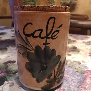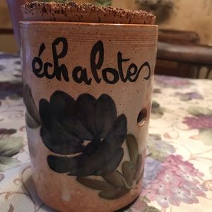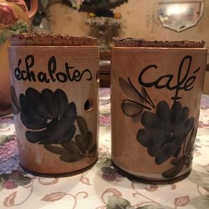 Made in France. Vintage canisters. One for shallots or garlic and one for coffee or coffee beans or whatever. Cork tops. In perfect condition. No chips or any damage. 5 1/2” high 4” wide. Really unique kitchen accessory.