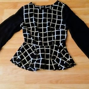 Sophisticated black and white blouse. Sleeves are sheer. Both professional and fun. Moderate wear. Fits like a XS. 100% polyester.