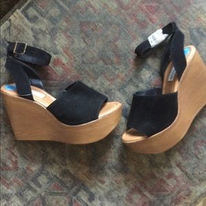 Beautiful Steve Madden black suede wood block wedge heel platform sandals open toe ankle wrap Steve Madden Kamry