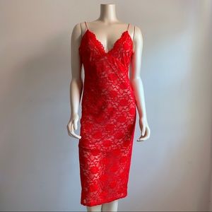 Red floral lace body on dress by ASOS with a partial open back, thin spaghetti straps, and inside lining/slip.