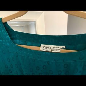 100% silk vintage dress. Square cut neck, button details on the shoulders, hits above the knee. Cinched at the waist. Can wear this dresses up, for work or casual. Very hipster style. Label says it’s from Trend. (gold belt not included). Size medium on label but it can fit a size 2 - 6 easily depending on the fit you’d like. I’m a size 4 in dresses.