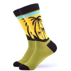 Description: A pair of men's (can also be worn by women) novelty cotton blend (80% cotton, 15% nylon, 5% spandex) crew socks. Length goes to just under calf. Soft stretchy fabric for a comfortable snug feel. Black trim, green foot, and yellow, black and blue palm tree scene. Can be worn casually or with a suit!