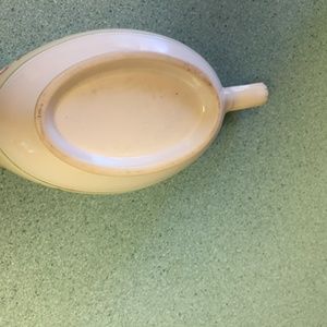 COVERED WITH KNOB HANDLED VEG BOWL AND HANDLED GRAVY SYRUP SAUCE SERVER - GOLD TRIMMED ON COVER , RIM AND BOTTOM OF BOWL AND GRAVY SERVER