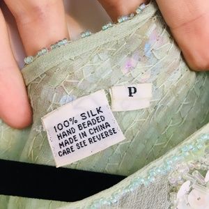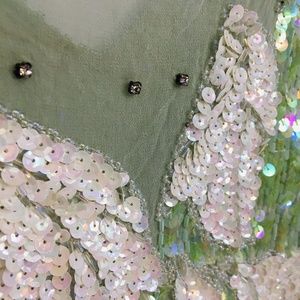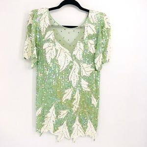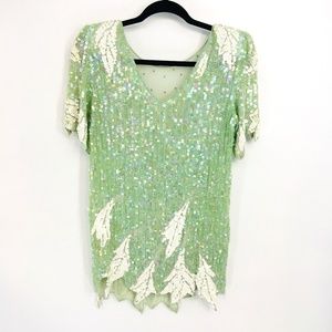 Vintage Green Sequin Short Sleeve Floral Blouse